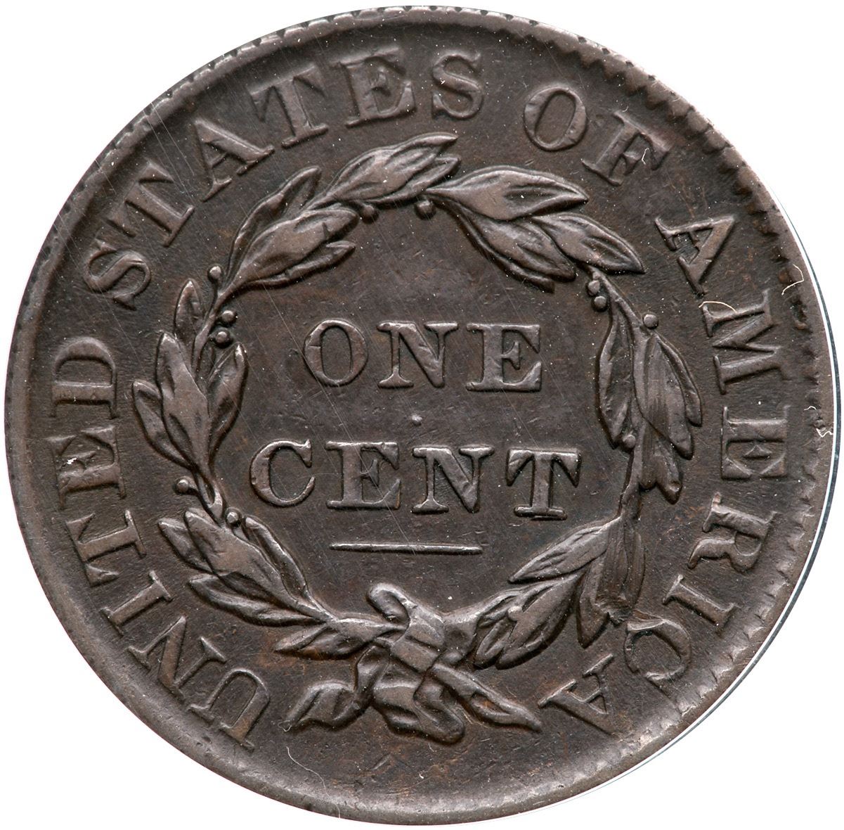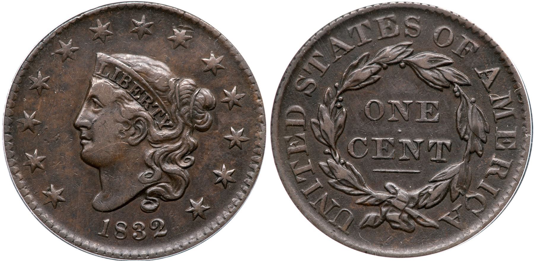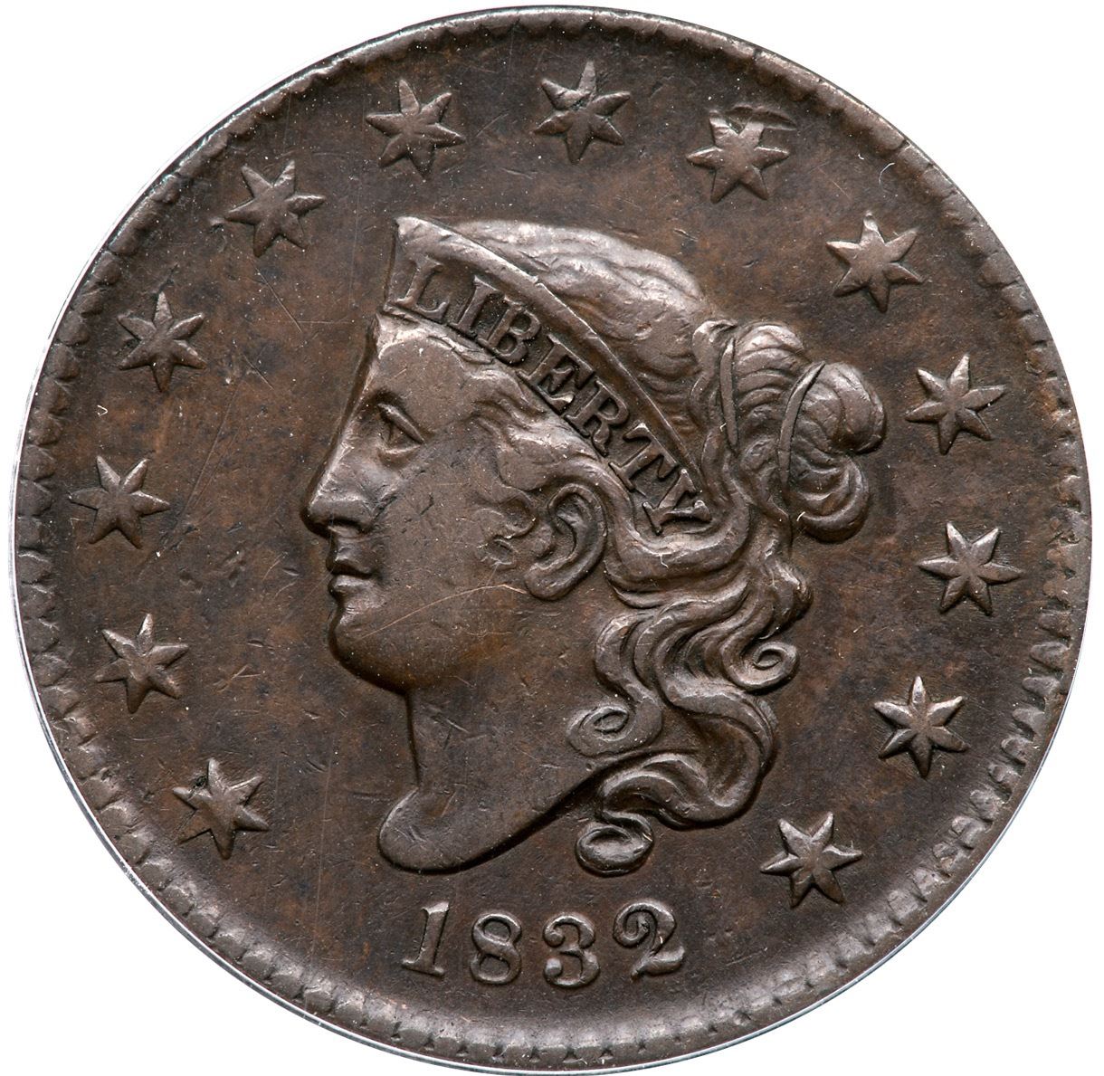 1832 N-3 R-1 ANACS VF35Large Letters. Glossy mottled light brown and chocolate obverse, the reverse mostly uniform chocolate. The notable marks include a nick over star 8, a hairline scratch on the lower cheek, and another couple right of star 3. Smooth, glossy surfaces. Our grade is VF25. 7309613Ex; Dennis Fuoss