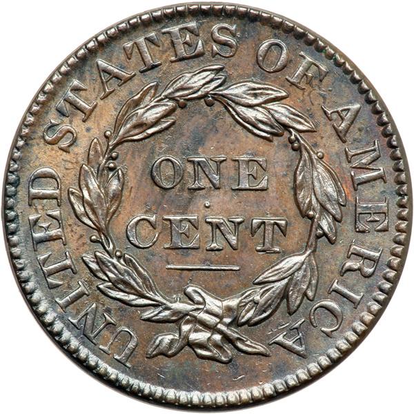 1832 N-3 R1 MS60. PCGS graded MS-62 Brown. Lustrous bluish steel brown speckled with darker olive and steel tones. There are several tiny ticks on the cheek, a tiny nick between the bottoms of stars 6 & 7, and a small rim nick at star 8. Sharply struck EDS. The dentils are crisp around both sides and the fields are smooth, just starting to display microscopic die flowlines. Our grade is MS60. Pop 1; 1 in 66. DWH #2469.