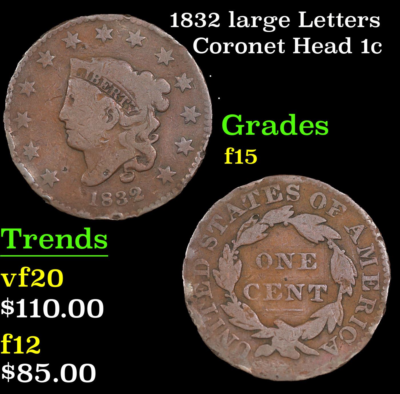 1832 large Letters Coronet Head Large Cent 1c Grades f+.