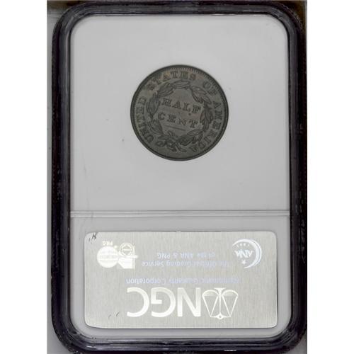 <B>1833<1/2 C> C-1, B-1, R.1. Die State 1. MS64 Brown NGC. MS60 EAC.</B></I> Large date, small stars; High leaf left of center below S. The obverse and reverse dies were each prepared fresh in 1833 for the beginning of production in the second Mint building. After a small quantity of proofs were coined, the dies clashed and cracked and were then used for business strikes. The quantity produced is not known, as the coinage of 1833 and 1834 half cents appeared to have overlapped for some period of time. This example is from the first die state listed by Manley for business strikes, and from Breen's Die State V, his second die state for business strikes. The obverse is cracked through the stars on the left, and the reverse has light clash marks inside the left part of the wreath. As with all Half Cent die state data from 1793 to 1857, we highly recommend the work of Ron Manley, and suggest that the Breen <I>Half Cent Encyclopedia,</B></I> be set aside. This is a fully lustrous example with chocolate and lighter tan color. The surfaces have only a few minor abrasions, including an identifying defect near Liberty's chin that is apparently a pre-strike planchet defect. Breen Die State V. Envelope Included.