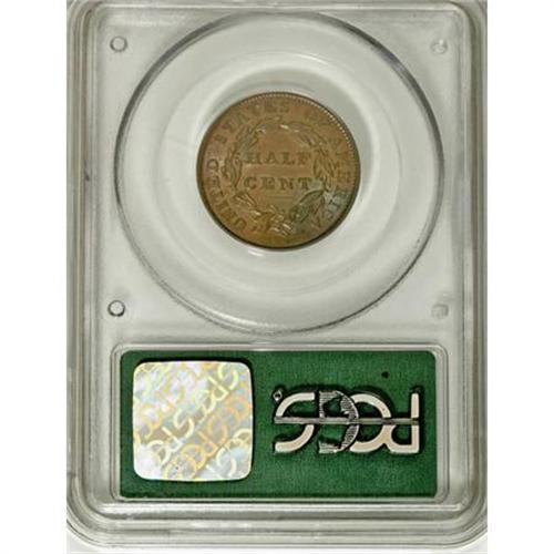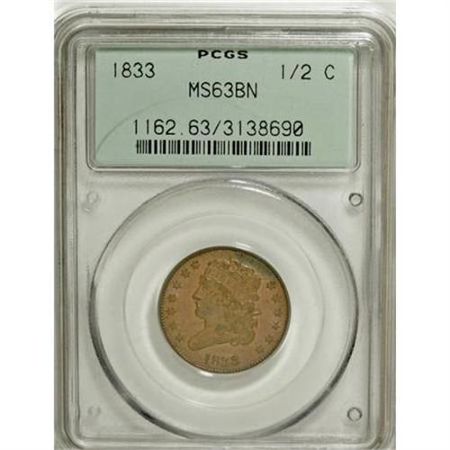 <B>1833 1/2 C MS63 Brown PCGS.</B></I> B-1, C-1, R.1. A lovely and carefully preserved half cent, golden-brown save for blushes of deeper steel-blue hues at 1 o'clock on the obverse and 5 o'clock on the reverse. This Classic Head piece is housed in a prior-generation holder. EAC 55.<BR><I>From The Beau Clerc Collection.</B></I><BR><BR><B>Coin Engraver:</B> John Reich<BR><BR><b>Shipping:</b> Coins & Currency (<a target="_blank" href="http://www.heritageauctions.com/common/shipping.php">view shipping information</a>)