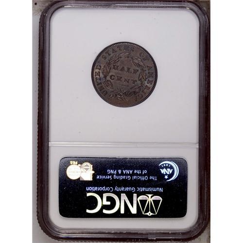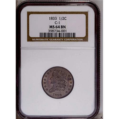 <B>1833<1/2 C> MS64 Brown NGC.</B></I> B-1, C-1, R.1. The only known dies. Lustrous light brownish-tan surfaces are imbued with subtle bluish-green accents, and the design elements are sharply brought up. Nicely preserved surfaces exhibit just a few grade-defining marks. Census: 73 in 64, 35 finer (3/06). EAC 60. <BR><BR><B>Important notice:</B> Heritage usually auctions material at the rate of 200-250 lots per hour. On some occasions eBay Live bid software or the Internet may not be able to keep up with the pace of the auction. We recommend placing a realistic absentee bid now as insurance to avoid disappointment. Occasionally the auctioneer may eliminate or reject an eBay Live bid, and the auctioneer may also reopen a lot after the close of the eBay live bidding (usually because we missed an audience bid), and may reject your bid even if it shows you as the winning bidder. By bidding via eBay Live, you agree that Heritage may award the lot to another bidder at its sole discretion under the circumstances described above or any other reasonable circumstances. Since eBay bids are not shown to us until we open the lot on the floor, we treat those bids just like floor bids. In most cases the floor responds before the eBay bid is presented to us, due to Internet lag time, so for consistency we have made it a policy that floor bids are always considered first over tie eBay live bids. Also please note that all Heritage lots purchased through eBay Live carry a 20% Buyer's Premium. Please make sure you read the Terms and Conditions before you bid. This lot is being auctioned in conjunction with a live floor auction by Heritage Galleries & Auctioneers. All final auction and invoice information will be supplied by Heritage Galleries & Auctioneers, and all other information should be considered preliminary. Lot:223 <BR><BR><B>Winning Notification and Billing:</B> After the FINAL session in this auction is complete, Heritage will send e-mail and snail mail invoices. This process normally takes several days. All final auction and invoice information will be supplied by Heritage Galleries & Auctioneers, and all other information should be considered preliminary. <BR><BR>This auction will be conducted on a live auction floor and over the Internet through eBay Live. If you choose to place an absentee bid, please take a moment to <font color='#0000ff'><u><a href='http://pages.ebay.com/liveauctions/help/before/laabsentee.html'>learn how eBay Live absentee bidding works</a></u></font><font color='#000000'>