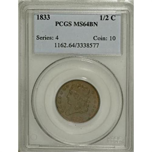 <B>1833 1/2 C MS64 Brown PCGS.</B></I> C-1, B-1, R.1. A sharply struck near-Gem that is remarkable free from abrasions. Struck from multiply clashed dies. The obverse rim has a small spot at 5 o'clock. EAC 55.<BR><BR><B>Coin Engraver:</B> John Reich<BR><BR><b>Shipping:</b> Coins & Currency (<a target="_blank" href="http://www.heritageauctions.com/common/shipping.php">view shipping information</a>)