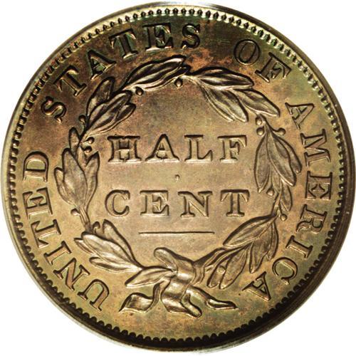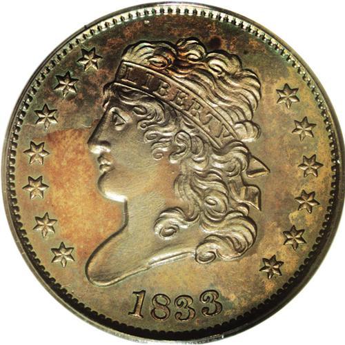 <B>1833<1/2 C> PR63 Brown PCGS.</B></I> C-1, B-1, R.5 as a proof. Breen Die State III. Only a single die pair was used to strike this date. Business strikes are common, but proofs are scarce. Breen speculates that proofs were struck to commemorate the opening of the second Philadelphia Mint. Not a restrike proof issue, since proofs were struck prior to the business strikes. This exquisitely struck specimen is iridescently toned orange, rose, and apple-green. Pleasing for the third party grade, since no distractions are present. EAC PR60.