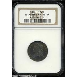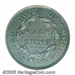 <table><tr><td><TABLE cellSpacing=0 cellPadding=0 width="100%" bgColor=#000000 border=0><TBODY> <TR><TD width="100%"><TABLE cellSpacing=1 cellPadding=3 width="100%" border=0><TBODY><TR><TD width="100%" bgColor=#79735c><FONT face=arial color=#ffffff size=3><B>Description</B> </FONT></TD></TR><TR><TD width="100%" bgColor=#ffffff><FONT face=arial size=2><B>1833 1/2 C PR64 Brown NGC.</B></I> B-1, C-1, the only known dies, R.5 as proof. All 1833 Classic Half Cents were struck from a single set of dies. Breen (1983) suggests that the proofs may have been struck to commemorate the opening of the new Philadelphia Mint in January 1833. Perhaps 50 specimens are believed extant, among which is this deeply toned example. Blue-green shades intermingle with chocolate-brown and blue accents. The obverse reveals a lighter brown spot at the juncture of Liberty's headband and the field, one of the primary identifiers of this rare coin. Aesthetically pleasing brightness in the fields shows as the coin is rotated under a light source. Uncommonly sharp striking definition further confirms this coin's status as a proof.<BR><I>Ex: Louis E. Eliasberg, Sr, Collection (Bowers and Merena, 3/1996), lot 447, which realized $3,740.</B></I> </FONT></TD></TR></TBODY></TABLE></TD></TR></TBODY></TABLE><BR><A name=PricesRealized></A><TABLE cellSpacing=0 cellPadding=0 width="100%" bgColor=#000000 border=0><TBODY><TR><TD width="100%"><TABLE cellSpacing=1 cellPadding=3 width="100%" border=0><TBODY><TR><TD width="100%" bgColor=#79735c><A name=PR><FONT face=arial color=#ffffff size=3><B>Previous Prices from Heritage Auctions</B> </FONT></A></TD></TR><TR><TD bgColor=#f6f6ed><TABLE cellSpacing=0 cellPadding=0 width="100%" border=1><TBODY><TR><TD align=middle width="33%"><B>Date</B></TD><TD align=middle width="33%"><B>Service</B></TD><TD align=middle width="33%"><B>Price</B></TD></TR><TR bgColor=whitesmoke><TD width="33%"><B>10/06/2000</B></TD><TD width="33%">PCGS</TD><TD width="33%">$4,945.00</TD></TR></TBODY></TABLE></TD></TR><TR><TD bgColor=#ffffff><FONT face=arial size=1 ?>PLEASE NOTE: All prices realized reflect the final hammer price PLUS the buyer's premium in auctions that charge a buyer's premium. Each item has a notation at the top of the listing indicating whether that lot included a buyer's premium. Example: A item that sells with a final hammer price of $100 and a 20% buyer's premium will display with a price realized of $120. All information listed is intended to be as accurate as possible, but errors are possible. Please use this guide carefully and inform us of any inaccuracies. </FONT></TD></TR></TBODY></TABLE></TD></TR></TBODY></TABLE><BR><TABLE cellSpacing=0 cellPadding=0 width="100%" bgColor=#000000 border=0><TBODY><TR><TD width="100%"><TABLE cellSpacing=1 cellPadding=3 width="100%" border=0><TBODY><TR><TD width="100%" bgColor=#79735c colSpan=6><FONT face=arial color=#ffffff size=3><B>Price Guide*</B> </FONT></TD></TR><TR bgColor=#f6f6ed><TD align=middle><B>Grade</B> </TD><TD align=middle><B>Coin World<BR>(Trends)</B> </TD><TD align=middle><B>Numismedia<BR>Retail</B> </TD><TD align=middle><B>Numismedia<BR>Wholesale</B> </TD><TD align=middle><B>Coin<BR>Universe</B> </TD><TD align=middle><B>Heritage<BR>Value Index</B> </TD></TR><TR bgColor=#ffffff><TD align=middle>63</TD><TD align=right>---</TD><TD align=right>---</TD><TD align=right>---</TD><TD align=right>$4,500.00</TD><TD align=right>$2,992.50</TD></TR><TR style="FONT-WEIGHT: bold" bgColor=#cccfdd><TD align=middle>64</TD><TD align=right>---</TD><TD align=right>---</TD><TD align=right>$4,840.00</TD><TD align=right>$4,650.00</TD><TD align=right>$3,675.00</TD></TR><TR bgColor=#ffffff><TD align=middle>65</TD><TD align=right>---</TD><TD align=right>---</TD><TD align=right>---</TD><TD align=right>---</TD><TD align=right>---</TD></TR><TR bgColor=#ffffff><TD colSpan=6><FONT size=1>*All information listed is intended to be as accurate as possible, but errors are possible. No item may be returned or refused based on this information which is provided as a service to our customers. You should contact each pricing source directly to determine the accuracy of this information. </FONT></TD></TR></TBODY></TABLE></TD></TR></TBODY></TABLE><BR><TABLE cellSpacing=0 cellPadding=0 width="100%" bgColor=#000000 border=0><TBODY><TR><TD width="100%"><TABLE cellSpacing=1 cellPadding=3 width="100%" border=0><TBODY><TR><TD width="100%" bgColor=#79735c><FONT face=arial color=#ffffff size=3><B>Population Guide</B> </FONT></TD></TR><TR bgColor=#ffffff><TD align=middle><!-- Begin Output of Population Grid--><TABLE cellSpacing=0 cellPadding=0 width="100%" border=0><TBODY><TR><TD vAlign=center><TABLE cellSpacing=0 width="100%" border=1 cellsadding="3"><TBODY><TR><TD vAlign=center><TABLE cellSpacing=0 cellPadding=3 width="100%" border=1><TBODY><TR><TD vAlign=center align=middle bgColor=#f0f1e8 colSpan=2 <CENTER><FONT face=Arial size=2><B>PCGS Pop </B></FONT><CENTER></CENTER></TD><TD vAlign=center align=middle bgColor=#f0f1e8 colSpan=2><CENTER><FONT face=Arial size=2><B>NGC Pop</B></CENTER></FONT></TD></TR><TR><TD vAlign=center><FONT face=Arial size=2>(64)</FONT> </TD><TD vAlign=center align=right><FONT face=Arial size=2>3</FONT> </TD><TD vAlign=center><FONT face=Arial size=2>(64)</FONT> </TD><TD vAlign=center align=right><FONT face=Arial size=2>5</FONT> </TD></TR><TR><TD vAlign=center><FONT face=Arial size=2>(>64)</FONT> </TD><TD vAlign=center align=right><FONT face=Arial size=2>0</FONT> </TD><TD vAlign=center><FONT face=Arial size=2>(>64)</FONT> </TD><TD vAlign=center align=right><FONT face=Arial size=2>1</FONT> </TD></TR></TBODY></TABLE></TD></TR></TBODY></TABLE></TD></TR></TBODY></TABLE><!-- End Output of Population Grid--></TD></TR></TBODY></TABLE></TD></TR></TBODY></TABLE><BR><TABLE cellSpacing=0 cellPadding=0 width="100%" bgColor=#000000 border=0><TBODY><TR> Important notice: Heritage usually auctions material at the rate of 200-250 lots per hour. On some occasions eBay Live bid software