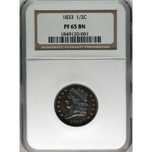 1833 1/2 C PR65 Brown NGC. R.5, as a proof. The 1833 i