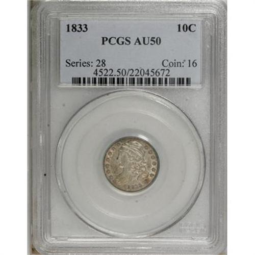 <B>1833 10C AU50 PCGS.</B></I> PCGS Population (12/152). NGC Census: (7/203). Mintage: 485,000. Numismedia Wsl. Price for NGC/PCGS coin in AU50: $288. (#4522)<BR><BR><B>Coin Engraver:</B> John Reich<BR><BR><b>Shipping:</b> Coins & Currency (<a target="_blank" href="http://www.heritageauctions.com/common/shipping.php">view shipping information</a>)