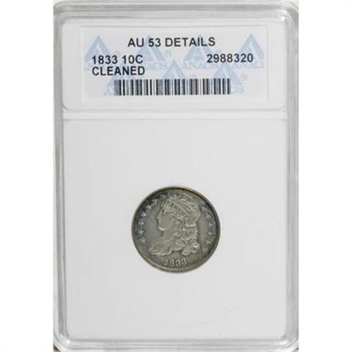 <B>1833 10C --Cleaned--ANACS. AU53 Details.</B></I> NGC Census: (6/195). PCGS Population (8/143). Mintage: 485,000. Numismedia Wsl. Price for NGC/PCGS coin in AU53: $300. (#4522)<BR><BR><B>Coin Engraver:</B> John Reich<BR><BR><b>Shipping:</b> Coins & Currency (<a target="_blank" href="http://www.heritageauctions.com/common/shipping.php">view shipping information</a>\)