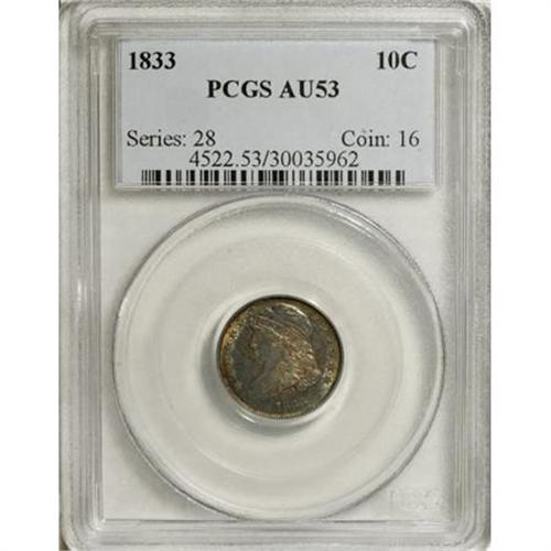 <B>1833 10C AU53 PCGS.</B></I> PCGS Population (8/145). NGC Census: (7/201). Mintage: 485,000. Numismedia Wsl. Price for NGC/PCGS coin in AU53: $325. (#4522)<BR><BR><B>Coin Engraver:</B> John Reich<BR><BR><b>Shipping:</b> Coins & Currency (<a target="_blank" href="http://www.heritageauctions.com/common/shipping.php">view shipping information</a>)