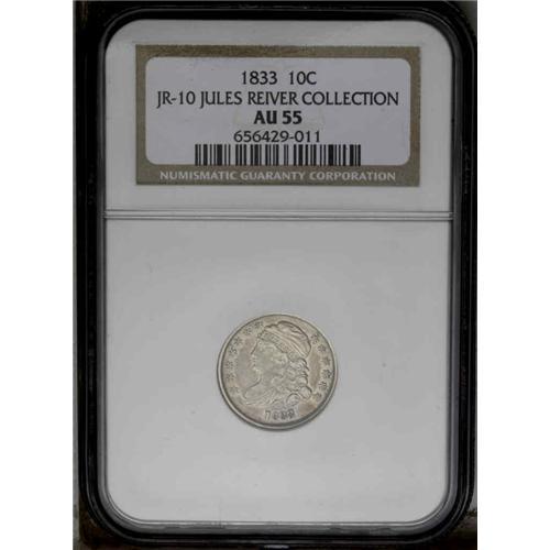 <B>1833<10C> JR-10, R.3. Reiver state a. AU55 NGC.</B></I> Silvery-gray with a blush of gold over the fields. Boldly struck by the dies with sharp stars and curls on the obverse, and the eagle's feathers and claws are crisp. On this die state the reverse is sharply clashed, and there is a trace of the die crack from the right upper serif of the second T in STATES down toward the E. On the obverse, a minor die crack connects the outer points of stars three to five. Scarce so well preserved despite the moderate rarity, and a nice collector coin to represent the variety.<BR><I>Ex: Stack's (October 1990) lot 140.</B></I> Envelope Included.