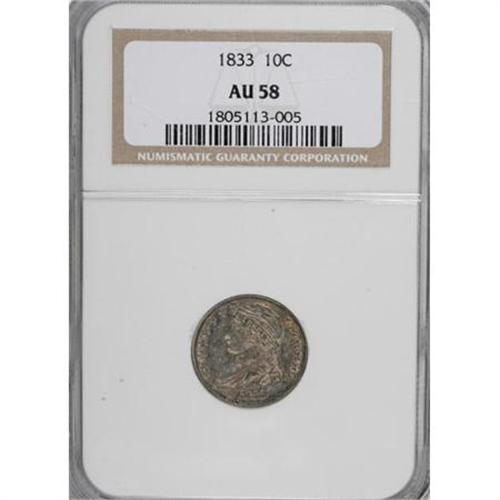 <B>1833 10C AU58 NGC.</B></I> NGC Census: (37/143). PCGS Population (21/96). Mintage: 485,000. Numismedia Wsl. Price for NGC/PCGS coin in AU58: $371. (#4522)<BR><BR><B>Coin Engraver:</B> John Reich<BR><BR><b>Shipping:</b> Coins & Currency (<a target="_blank" href="http://www.heritageauctions.com/common/shipping.php">view shipping information</a>)