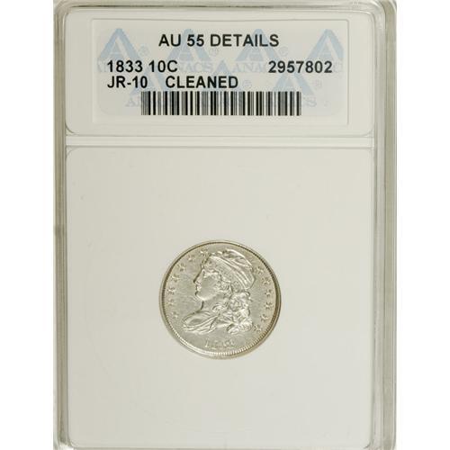 <B>1833 10C --Cleaned--ANACS. AU55 Details.</B></I> JR-10. NGC Census: (17/176). PCGS Population (26/118). Mintage: 485,000. Numismedia Wsl. Price: $317. (#4522)<BR><BR><b>Shipping:</b> Coins & Currency (<a target="_blank" href="http://www.heritageauctions.com/common/shipping.php">view shipping information</a>)