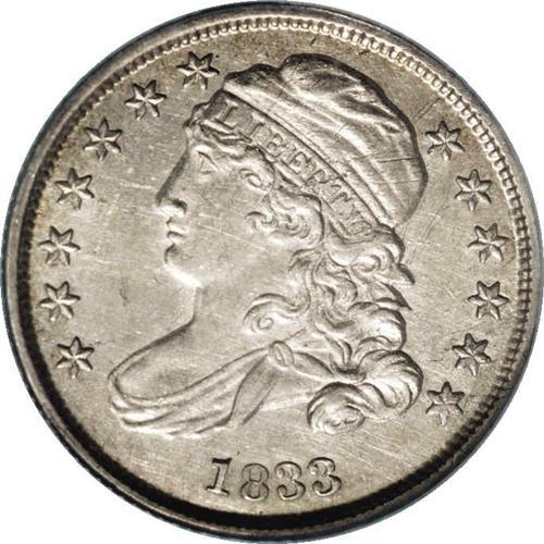 <B>1833<10C> JR-3, R.6. Reiver state a.--Improperly Cleaned--NCS. AU Details.</B></I> The John Reich dime book plate coin. The surfaces of this coin have been cleaned with an abrasive with resulting hairlines over the surfaces, and most of Liberty's cap has fine scratches which are best seen with a loupe. The reverse has also been cleaned and has matching surfaces to the obverse. Bright silver throughout, with a hint of gold starting to form around the periphery. Some luster remains in the protected areas, and this offsets the visual effects of the cleaning to a degree. Boldly struck by the dies, with sharp stars and curls on the obverse, and the reverse boasts full definition on the eagle's claws and wings. On balance, this is a very acceptable coin for this rare variety despite the problems mentioned, and a coin that is still well up in the Condition Census behind an MS63 example discovered by Bill Subjack some years ago, and the Benson coin which was found in that date collection and sold in 2002 (AU55).<BR> For this obverse die, it was first used to coin the 1833 JR-1 variety, then paired with this reverse die, and later went on to coin the 1833 JR-4 and JR-10 variety where it was finally retired with moderate die cracks through the stars and to Liberty's drapery. The reverse die is more interesting here, it was first used to coin the 1832 JR-4 variety, then the 1832 JR-5 coins. While coining the 1832 dimes, this reverse developed several minor die cracks which were not severe enough to preclude further coinage. As 1833 unfolded, the coiner paired this die with the obverse die and began to strike more coins. At first, the die crack over the final A of AMERICA seemed minor, but while coining this variety, the die crack extended down the right leg of the A to the arrowheads below, curling back to the rim below the second arrowhead and this formed a retained cud. Most examples of this variety show the retained cud to some degree, and it is not known if a full cud specimen has been found of this variety. The reverse die was replaced after very few were coined, and this created one of the most elusive die pairings in the entire Capped Bust dime series.<BR><I>Ex: Milford Coin Company (1947); Allen F. Lovejoy; Stack's Lovejoy Sale (October 1990).</B></I> Envelope Included.