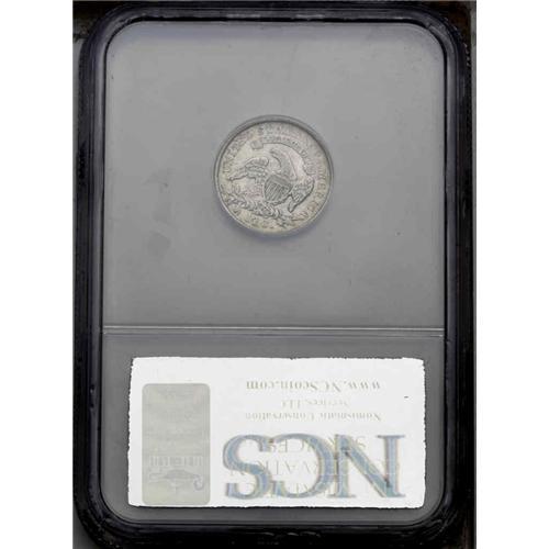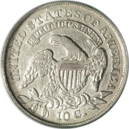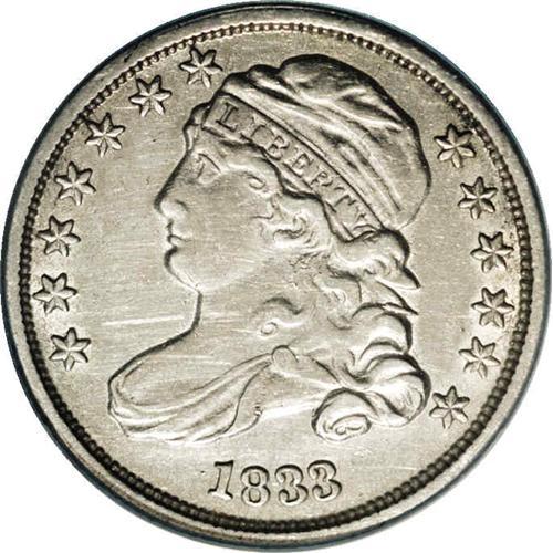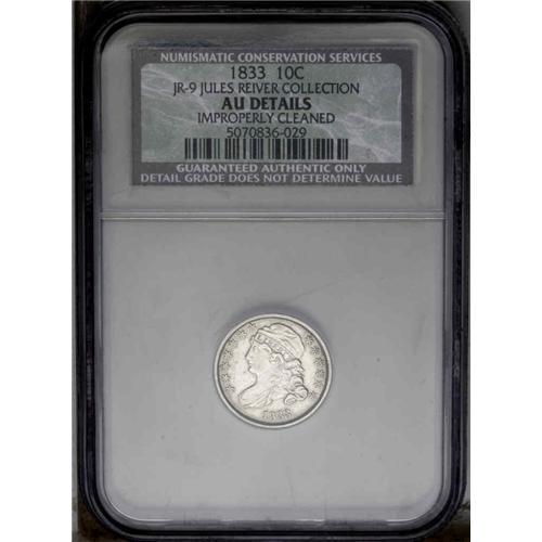 <B>1833<10C> JR-9, R.2. Reiver state c.--Improperly Cleaned--NCS. AU Details.</B></I> This coin has been cleaned with an abrasive which has left heavy hairlines at the center of the obverse, and removed all but a trace of luster. Bright silver with a hint of gold starting to return to the periphery. Sharply impressed on the obverse, while the reverse is sharp on all save for the eagle's neck. A very late reverse die state with strong die cracks from the left wing tip, the ATE in STATES with a raised retained cud below AT to the scroll, and sharp clashmarks in the field from Liberty's head surrounding the eagle. This die state is not reported in <I>Early United States Dimes 1796-1837</B></I> and is probably one of the last struck from this die.<BR> Although not reported so far as we know, this die state is obviously a remarriage of this obverse and reverse. Most examples of the JR-9 variety show the early die state of the reverse or the later state with a single die crack through the right side of the A in STATES to the scroll. The obverse die was then removed from the press, and the JR-10 variety was coined using this same reverse die with the die crack through the A of STATES. While coining the JR-10 variety of 1833, the reverse die clashed heavily with the obverse, leaving Liberty's head outlined around the eagle. The JR-9 obverse returned to the coining press and additional coins were struck, and a new die crack appeared through the TE of STATES to the scroll, and a retained cud formed below those letters. Soon after this point, the reverse was retired.<BR><I>Ex: Privately from ANA Sale (February 1987).</B></I> Envelope Included.