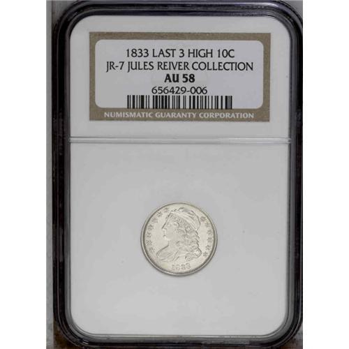 <B>1833<10C> Last 3 High JR-7, R.5. Reiver state b. AU58 NGC.</B></I> Mostly brilliant surfaces with just a hint of gold at the obverse rim. Original mint luster still survives in the fields especially on the reverse. Virtually all design features are boldly defined including the obverse stars, Liberty's hair curls and drapery, and the eagle's feathers and claws. A dark streak beneath the left wing continues right into the eagle and shield and this hallmarks the coin. This is a later die state example with a minor die crack to the top of Liberty's cap from the rim above, and on the reverse the die crack to the A in STATES is sharp. Certainly within the Condition Census behind a couple of mint state coins which have turned up in the past few decades, and a very impressive coin to represent this variety.<BR><I>Ex: Coin Galleries (February 1991).</B></I> Envelope Included.
