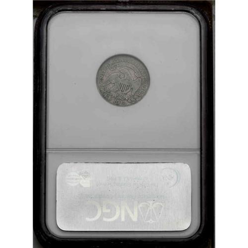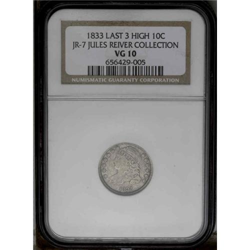 <B>1833<10C> Last 3 High JR-7, R.5. Reiver state a. VG10 NGC.</B></I> Dark silver with traces of charcoal gray near the devices. A rare die pairing which has not turned up in large numbers, and most found are in fairly low grades. This appears to be a middle die state with a minor die crack to the upper left olive leaf, but there is too much wear to see if the die crack to the A in STATES is present.<BR><I>Ex: Don Frederick (August 1981).</B></I> Envelope Included.