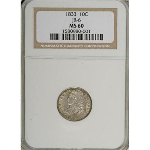 <B>1833 10C MS60 NGC.</B></I> JR-6, R.1. The second S in STATES is directly above the second U in PLURIBUS. Pearl-gray and autumn-gold tints enrich the margins of this boldly impressed and unblemished Capped Bust dime.<BR><BR><B>Coin Engraver:</B> John Reich<BR><BR><b>Shipping:</b> Coins & Currency (<a target="_blank" href="http://www.heritageauctions.com/common/shipping.php">view shipping information</a>)