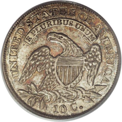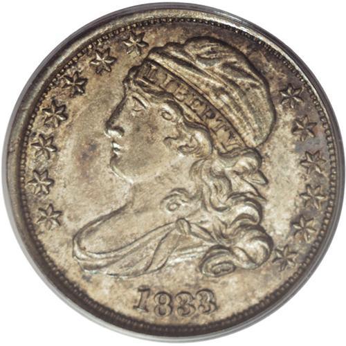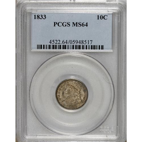 <B>1833 10C MS64 PCGS.</B></I> JR-9, R.2. The second S in STATES is repunched on this available die marriage. Olive and golden-tan embrace this well struck and satiny near-Gem. Only the eagle's right (facing) claw lacks intricate detail. Inspection beneath a loupe fails to reveal any abrasions.<BR><BR><b>Shipping:</b> Coins & Currency (<a target="_blank" href="http://www.heritageauctions.com/common/shipping.php">view shipping information</a>)
