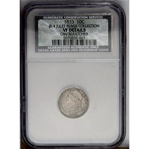 <B>1833<10C> JR-4, R.1. Reiver state c.--Obverse Scratched--NCS. VF Details.</B></I> Medium gray with darker gray with flecks of blue in the fields. The obverse has two long scratches, one from the upper left rim down through her face, the other through her cap into her curls. A short scratch is found in the field touching the lower point of the fifth star. An interesting later die state with the beginnings of the retained cud on the reverse with sinking through ED of UNITED which continues up to the E of STATES, and this retained cud continues to sink as more coins were struck. One of the more available retained cuds from this series.<BR><I>Ex: Hadaway (March 1984).</B></I> Envelope Included.