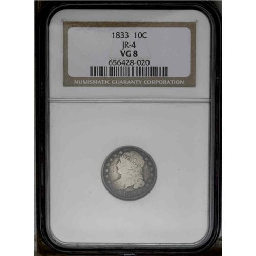 1833 10C VG8 NGC. JR-4, R.1. Pale lilac gray toning in 1833[10C] JR-4, R.1. Reiver state e. VG8 NGC.