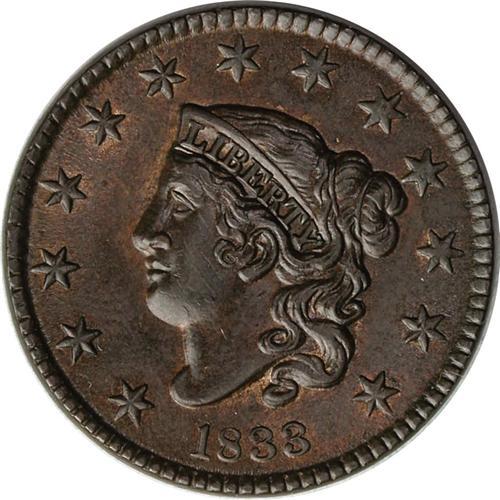1833 1C MS62 NGC. N-6, R.1. Chocolate with faded mint 1833[1C] N-6, R.1. MS62 NGC. MS60+ EAC.