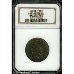 1833 1C MS65 Brown NGC. N-1, R.2. A boldly struck 1833 1C MS65 Brown NGC.