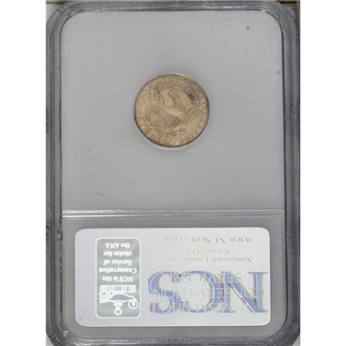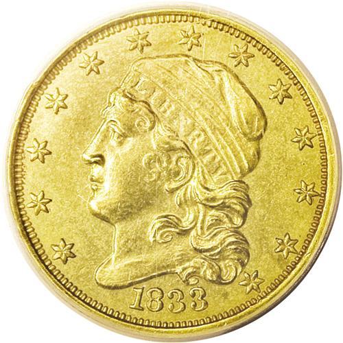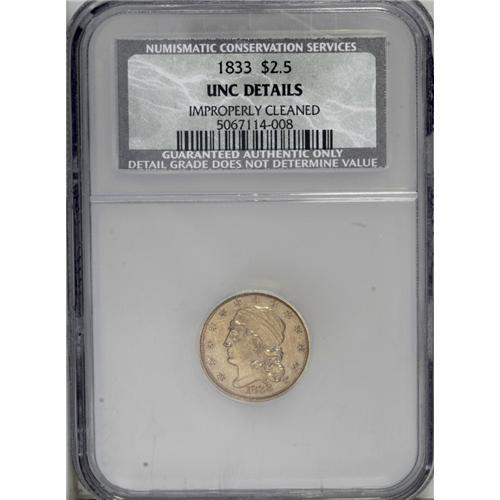 <B>1833<$2 1/2>--Improperly Cleaned--NCS. Unc. Details.</B></I> Breen-6136, BD-1, R.5. This sharply struck rare date Capped Head quarter eagle has unnaturally glossy fields, and a few specks of translucent blue glue residue are seen on the NU in UNUM and beneath the eagle's left (facing) wing. Nonetheless, this piece will suffice for many collectors, since unimpaired pieces seldom appear at auction.