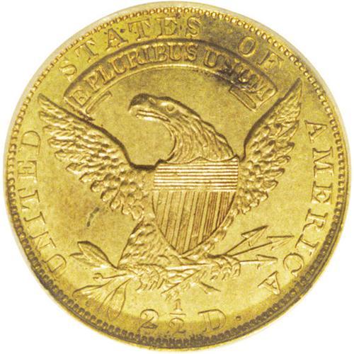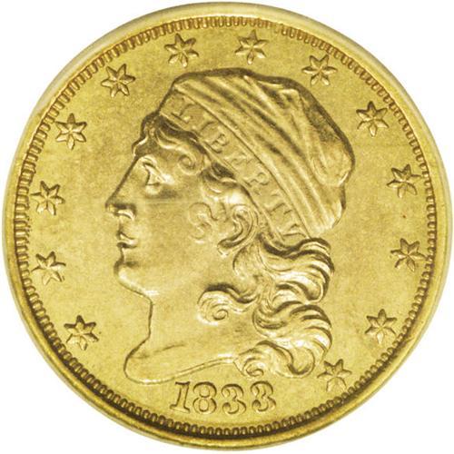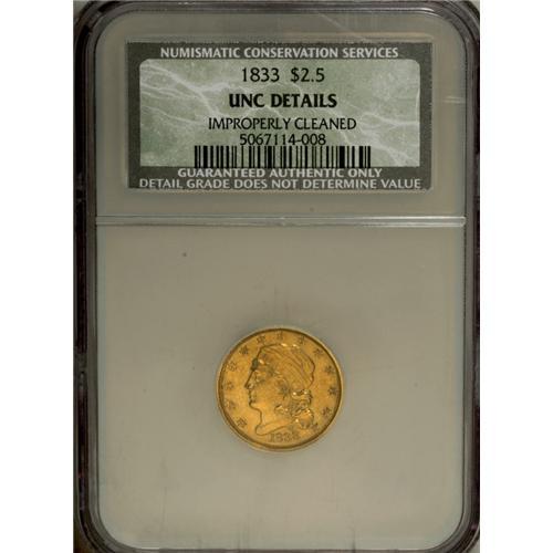<B>1833 $2 1/2 --Improperly Cleaned--NCS. Unc. Details.</B></I> Breen-6136, BD-1, R.5. A sharply struck but glossy canary-gold example of this formidably rare date. A blue spot is noted on portions of UNUM. A mintage of 4,160 pieces is reported, but perhaps only 1% of that figure has survived gold melts.<BR><BR><b>Shipping:</b> Coin/Currency (<a target="_blank" href="http://www.heritageauctions.com/common/shipping.php">view shipping information</a>)