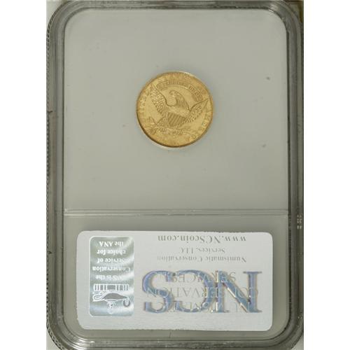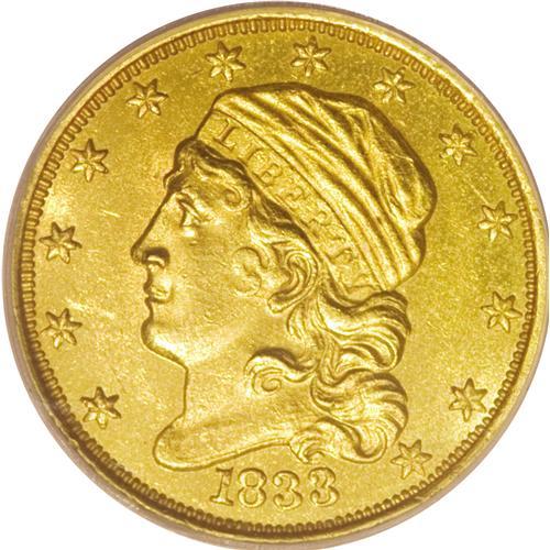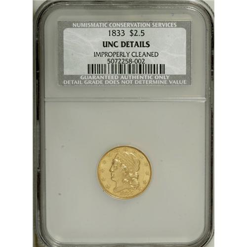 <B>1833 $2 1/2 --Improperly Cleaned--NCS. Unc Details.</B></I> Breen-6136, BD-1, R.5. Every quarter eagle issue from 1829 through 1834 (With Motto) has a mintage within the range of 3,403 coins and 4,540 coins. In the case of 1833, production totaled 4,160 pieces. With slight variance, each of these issues are known to the extent of about 100 coins, although John Dannreuther estimated 60 to 80 pieces known for this date. This piece is sharply detailed with slightly reflective fields and finely abraded surfaces. Both sides have bright yellow-gold color. It is an excellent candidate for the date or type collector, and only infrequently offered in any quality.<BR><BR><b>Shipping:</b> Coins & Currency (<a target="_blank" href="http://www.heritageauctions.com/common/shipping.php">view shipping information</a>)