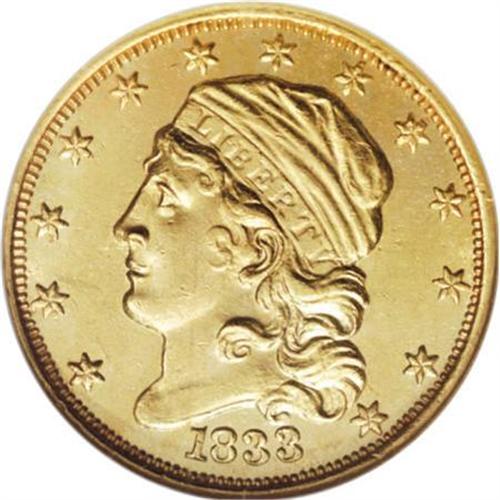 <B>1833 $2 1/2 MS62 NGC.</B></I> Breen-6136, BD-1, R.5. Every quarter eagle from 1829 through 1834, prior to the first Classic Head coins, are extremely rare in any and all grades. The 1833 has been called by some the rarest of the rare, for it is more elusive than any other date in this short series, except for the 1834 Capped Head coinage, a major rarity. Except for the center on each side, every detail is boldly defined. The fields are reflective, as usual, since the limited mintage means that every coin is an early strike. The surfaces have gorgeous greenish yellow-gold color.<BR><BR><B>Coin Engraver:</B> John Reich<BR><BR><b>Shipping:</b> Coins & Currency (<a target="_blank" href="http://www.heritageauctions.com/common/shipping.php">view shipping information</a>)