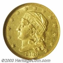 <TABLE cellSpacing=0 cellPadding=0 width="100%" bgColor=#000000 border=0><TBODY><TR><TD width="100%"><TABLE cellSpacing=1 cellPadding=3 width="100%" border=0><TBODY><TR><TD width="100%" bgColor=#79735c><FONT face=arial color=#ffffff size=3><B>Description</B> </FONT></TD></TR><TR><TD width="100%" bgColor=#ffffff><FONT face=arial size=2><B>1833 $2 1/2 MS62 NGC.</B></I> Few other early types can compete with the Capped Bust Left series of Quarter Eagles for consistently low mintage and rarity. Most were victims of melting within a few years after their production as the intrinsic value of the gold content exceeded the face value. Among the most challenging dates in the series, the 1833 compares favorably in rarity with all but the elusive 1834 Motto, an issue that saw almost its entire mintage melted. This bright yellow-gold survivor comes somewhat weakly struck in the centers and on the obverse stars, as is normally seen, with a series of adjustment marks noted across the eagle's shield. An important offering for the early gold specialist. Population: 2 in 62, 3 finer (7/03). </FONT></TD></TR></TBODY></TABLE></TD></TR></TBODY></TABLE><BR><A name=PricesRealized></A><TABLE cellSpacing=0 cellPadding=0 width="100%" bgColor=#000000 border=0><TBODY><TR><TD width="100%"><TABLE cellSpacing=1 cellPadding=3 width="100%" border=0><TBODY><TR><TD width="100%" bgColor=#79735c><A name=PR><FONT face=arial color=#ffffff size=3><B>Previous Prices from Heritage Auctions</B> </FONT></A></TD></TR><TR><TD bgColor=#f6f6ed>No Prior Data Recorded </TD></TR><TR><TD bgColor=#ffffff><FONT face=arial size=1 ?>PLEASE NOTE: All prices realized reflect the final hammer price PLUS the buyer's premium in auctions that charge a buyer's premium. Each item has a notation at the top of the listing indicating whether that lot included a buyer's premium. Example: A item that sells with a final hammer price of $100 and a 20% buyer's premium will display with a price realized of $120. All information listed is intended to be as accurate as possible, but errors are possible. Please use this guide carefully and inform us of any inaccuracies. </FONT></TD></TR></TBODY></TABLE></TD></TR></TBODY></TABLE><BR><TABLE cellSpacing=0 cellPadding=0 width="100%" bgColor=#000000 border=0><TBODY><TR><TD width="100%"><TABLE cellSpacing=1 cellPadding=3 width="100%" border=0><TBODY><TR><TD width="100%" bgColor=#79735c colSpan=6><FONT face=arial color=#ffffff size=3><B>Price Guide*</B> </FONT></TD></TR><TR bgColor=#f6f6ed><TD align=middle><B>Grade</B> </TD><TD align=middle><B>Coin World<BR>(Trends)</B> </TD><TD align=middle><B>Numismedia<BR>Retail</B> </TD><TD align=middle><B>Numismedia<BR>Wholesale</B> </TD><TD align=middle><B>Coin<BR>Universe</B> </TD><TD align=middle><B>Heritage<BR>Value Index</B> </TD></TR><TR bgColor=#ffffff><TD align=middle>61</TD><TD align=right>---</TD><TD align=right>---</TD><TD align=right>$13,500.00</TD><TD align=right>$12,750.00</TD><TD align=right>$11,741.67</TD></TR><TR style="FONT-WEIGHT: bold" bgColor=#cccfdd><TD align=middle>62</TD><TD align=right>$25,000.00</TD><TD align=right>---</TD><TD align=right>$17,500.00</TD><TD align=right>---</TD><TD align=right>$16,662.50</TD></TR><TR bgColor=#ffffff><TD align=middle>63</TD><TD align=right>$35,000.00</TD><TD align=right>---</TD><TD align=right>$24,500.00</TD><TD align=right>---</TD><TD align=right>$21,925.00</TD></TR><TR bgColor=#ffffff><TD colSpan=6><FONT size=1>*All information listed is intended to be as accurate as possible, but errors are possible. No item may be returned or refused based on this information which is provided as a service to our customers. You should contact each pricing source directly to determine the accuracy of this information. </FONT></TD></TR></TBODY></TABLE></TD></TR></TBODY></TABLE><BR><TABLE cellSpacing=0 cellPadding=0 width="100%" bgColor=#000000 border=0><TBODY><TR><TD width="100%"><TABLE cellSpacing=1 cellPadding=3 width="100%" border=0><TBODY><TR><TD width="100%" bgColor=#79735c><FONT face=arial color=#ffffff size=3><B>Population Guide</B> </FONT></TD></TR><TR bgColor=#ffffff><TD align=middle><!-- Begin Output of Population Grid--><TABLE cellSpacing=0 cellPadding=0 width="100%" border=0><TBODY><TR><TD vAlign=center><TABLE cellSpacing=0 width="100%" border=1 cellsadding="3"><TBODY><TR><TD vAlign=center><TABLE cellSpacing=0 cellPadding=3 width="100%" border=1><TBODY><TR><TD vAlign=center align=middle bgColor=#f0f1e8 colSpan=2 <CENTER><FONT face=Arial size=2><B>PCGS Pop </B></FONT><CENTER></CENTER></TD><TD vAlign=center align=middle bgColor=#f0f1e8 colSpan=2><CENTER><FONT face=Arial size=2><B>NGC Pop</B></CENTER></FONT></TD></TR><TR><TD vAlign=center><FONT face=Arial size=2>(62)</FONT> </TD><TD vAlign=center align=right><FONT face=Arial size=2>4</FONT> </TD><TD vAlign=center><FONT face=Arial size=2>(62)</FONT> </TD><TD vAlign=center align=right><FONT face=Arial size=2>2</FONT> </TD></TR><TR><TD vAlign=center><FONT face=Arial size=2>(>62)</FONT> </TD><TD vAlign=center align=right><FONT face=Arial size=2>5</FONT> </TD><TD vAlign=center><FONT face=Arial size=2>(>62)</FONT> </TD><TD vAlign=center align=right><FONT face=Arial size=2>3</FONT> </TD></TR></TBODY></TABLE></TD></TR></TBODY></TABLE></TD></TR></TBODY></TABLE><!-- End Output of Population Grid--> Important notice: Heritage usually auctions material at the rate of 200-250 lots per hour. On some occasions eBay Live bid software or the Internet may not be able to keep up with the pace of the auction. We recommend placing a realistic absentee bid now as insurance to avoid disappointment. Occasionally the auctioneer may eliminate or reject an eBay Live bid, and the auctioneer may also reopen a lot after the close of the eBay live bidding (usually because we missed an audience bid), and may reject your bid even if it shows you as the winning bidder. By bidding via eBay Live, you agree that Heritage may award the lot to another bidder at its sole discretion under the circumstances described ab