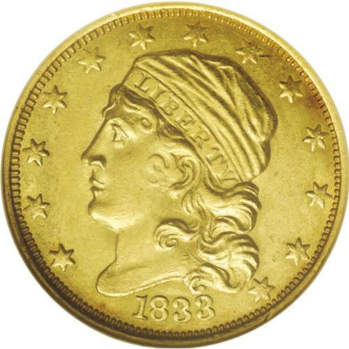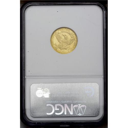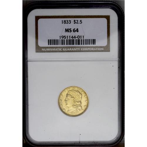 <B>1833<$2 1/2> MS64 NGC.</B></I> Bass-3030, Breen-6136, R.4. The only dies known for this rare low mintage date. Both 3s in the date are lightly recut, and the reverse shows broad repunching on the U in UNITED and the I in AMERICA. 4,160 pieces were struck, and most of these were promptly melted since the bullion value exceeded face. It was not until the next year, 1834, that the weight of gold coins was reduced, which allowed such pieces to enter circulation. PCGS has certified two 1833 quarter eagles in VF grades, but these were likely carried as souvenirs by a 19th century owner. Most survivors are in AU or lower Mint State grades. NGC and PCGS combined have certified only five examples above the MS64 level.<BR> The present smooth, unmarked olive-gold representative is generally sharply struck on the major devices. The stars are flat, and the eagle's shield and the curl left of the ear shows some softness. The open fields are mildly prooflike, while cartwheel luster dominates the remaining areas. A desirable, high-grade near-Gem worthy of the finest quality early gold date or type collection. Census: 6 in 64, 2 finer (2/06).
