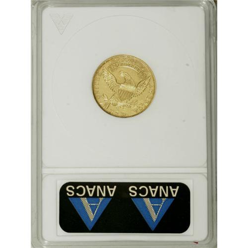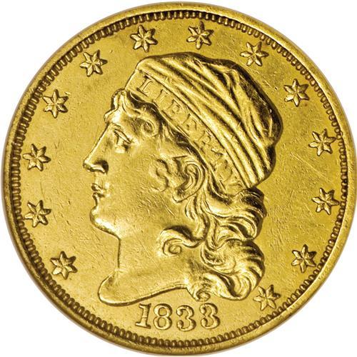<B>1833 $2 1/2 --Repaired, Cleaned--ANACS. AU55 Details.</B></I> Breen-6136, BD-1, R.5. Only 4,160 examples of the 1833 quarter eagle were made, and it is a bit rarer than the 1830-32 issues. Only the 1834 With Motto quarter eagle is rarer, within the subtype. It appears that some smoothing has been accomplished in the reverse field around the eagle's head, as the appearance is a bit more muted, despite a subsequent light overall cleaning. This has been done quite expertly, and the coin retains a completely attractive appearance.<BR><BR><b>Shipping:</b> Coins & Currency (<a target="_blank" href="http://www.heritageauctions.com/common/shipping.php">view shipping information</a>)