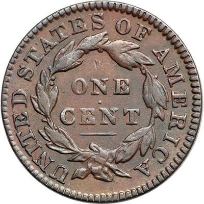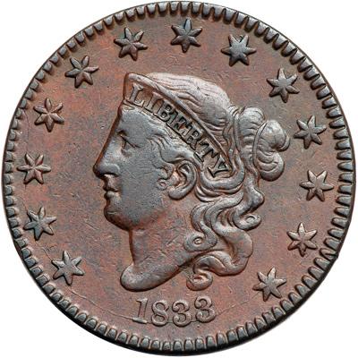 1833/2 N-4 R4. VF-30. Overdate 3 over 2. Five points sharper but the surfaces are a bit dull from extremely faint roughness. No verdigris and just a few minor contact marks including a pair of nicks over the N in ONE. Rather frosty reddish chocolate and olive brown. Nicely struck MDS with several die cracks on the obverse. The overdate remains clear at the left top of the second 3.