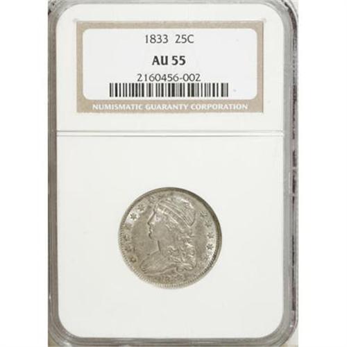 <B>1833 25C AU55 NGC.</B></I> B-1, R.2. Luster brightens the eagle and borders, and wear is generally limited to the highpoints of the portrait. A few faint marks on the reverse field are of little import.<BR><BR><B>Coin Engraver:</B> William Kneass<BR><BR><b>Shipping:</b> Coins & Currency (<a target="_blank" href="http://www.heritageauctions.com/common/shipping.php">view shipping information</a>)