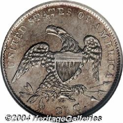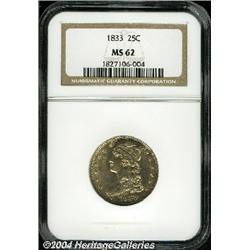 <B>1833<25C> MS62 NGC.</B></I> B-1, R.2. Light russet toning bathes bright surfaces that reveal several die rust pimples, especially around some of the borders of each side. Nicely struck, save for softness in the drapery at the bust line, in Liberty's curls, and in the star centers along the lower left border. A couple of minor contact marks are noted, along with some as struck clash marks. Overall, a very nice looking Capped Bust quarter. Population: 5 in 62, 26 finer (9/04). <BR><BR><B>Important notice:</B> Heritage usually auctions material at the rate of 200-250 lots per hour. On some occasions eBay Live bid software or the Internet may not be able to keep up with the pace of the auction. We recommend placing a realistic absentee bid now as insurance to avoid disappointment. Occasionally the auctioneer may eliminate or reject an eBay Live bid, and the auctioneer may also reopen a lot after the close of the eBay live bidding (usually because we missed an audience bid), and may reject your bid even if it shows you as the winning bidder. By bidding via eBay Live, you agree that Heritage may award the lot to another bidder at its sole discretion under the circumstances described above or any other reasonable circumstances. Since eBay bids are not shown to us until we open the lot on the floor, we treat those bids just like floor bids. In most cases the floor responds before the eBay bid is presented to us, due to Internet lag time, so for consistency we have made it a policy that floor bids are always considered first over tie eBay live bids. Also please note that all Heritage lots purchased through eBay Live carry a 20% Buyer's Premium. Please make sure you read the Terms and Conditions before you bid.