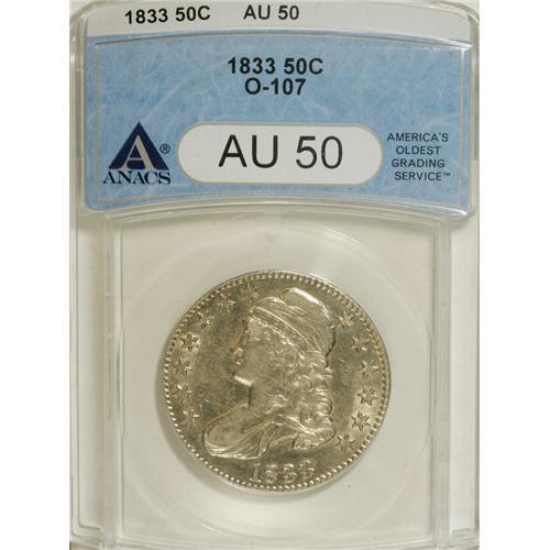 <B>1833 50C AU50 ANACS.</B></I> O-107. NGC Census: (42/715). PCGS Population (83/559). Mintage: 5,206,000. Numismedia Wsl. Price: $221. (#6163)<BR><BR><b>Shipping:</b> Coins & Currency (<a target="_blank" href="http://www.heritageauctions.com/common/shipping.php">view shipping information</a>)