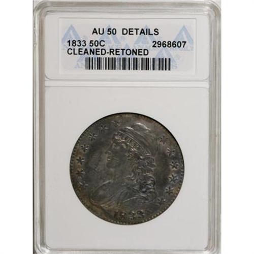 <B>1833 50C --Cleaned, Retoned--ANACS AU50 Details.</B></I> NGC Census: (47/754). PCGS Population (90/611). Mintage: 5,206,000. Numismedia Wsl. Price for NGC/PCGS coin in AU50: $325. (#6163)<BR><BR><B>Coin Engraver:</B> John Reich<BR><BR><b>Shipping:</b> Coins & Currency (<a target="_blank" href="http://www.heritageauctions.com/common/shipping.php">view shipping information</a>)