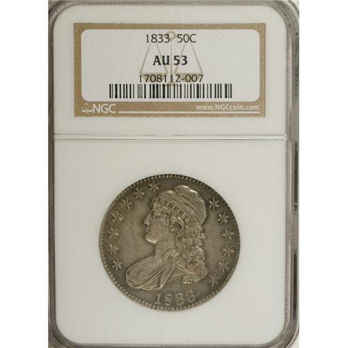 <B>1833 50C AU53 NGC.</B></I> NGC Census: (60/660). PCGS Population (54/506). Mintage: 5,206,000. Numismedia Wsl. Price for NGC/PCGS coin in AU53: $233. (#6163)<BR><BR><b>Shipping:</b> Coins & Currency (<a target="_blank" href="http://www.heritageauctions.com/common/shipping.php">view shipping information</a>)