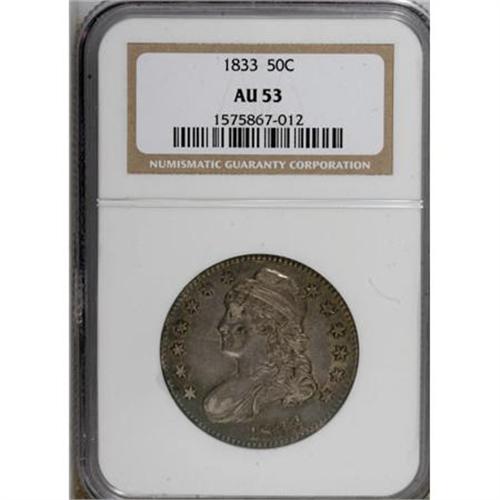 <B>1833 50C AU53 NGC.</B></I> NGC Census: (66/672). PCGS Population (59/528). Mintage: 5,206,000. Numismedia Wsl. Price for NGC/PCGS coin in AU53: $233. (#6163)<BR><BR><B>Coin Engraver:</B> John Reich<BR><BR><b>Shipping:</b> Coins & Currency (<a target="_blank" href="http://www.heritageauctions.com/common/shipping.php">view shipping information</a>)
