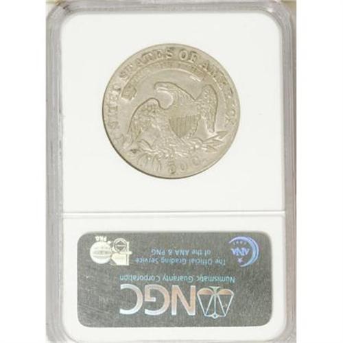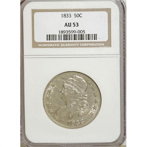 <B>1833 50C AU53 NGC.</B></I> NGC Census: (68/676). PCGS Population (59/534). Mintage: 5,206,000. Numismedia Wsl. Price for NGC/PCGS coin in AU53: $233. (#6163)<BR><BR><B>Coin Engraver:</B> John Reich<BR><BR><b>Shipping:</b> Coins & Currency (<a target="_blank" href="http://www.heritageauctions.com/common/shipping.php">view shipping information</a>)