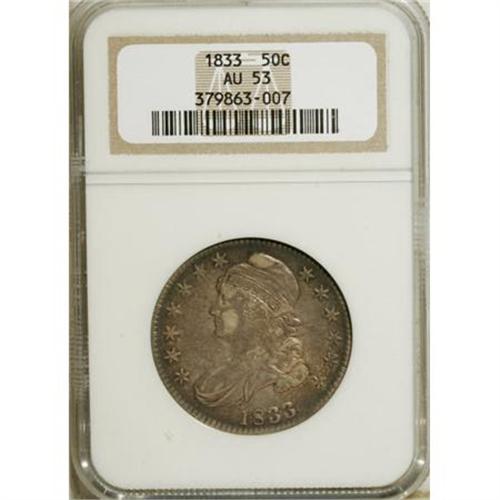 <B>1833 50C AU53 NGC.</B></I> O-108. NGC Census: (69/687). PCGS Population (62/560). Mintage: 5,206,000. Numismedia Wsl. Price for NGC/PCGS coin in AU53: $350. (#6163)<BR><BR><B>Coin Engraver:</B> John Reich<BR><BR><b>Shipping:</b> Coins & Currency (<a target="_blank" href="http://www.heritageauctions.com/common/shipping.php">view shipping information</a>)