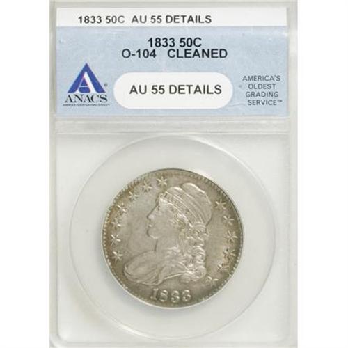 <B>1833 50C --Cleaned--ANACS. AU55 Details.</B></I> O-104. NGC Census: (124/548). PCGS Population (127/405). Mintage: 5,206,000. Numismedia Wsl. Price for NGC/PCGS coin in AU55: $275. (#6163)<BR><BR><B>Coin Engraver:</B> John Reich<BR><BR><b>Shipping:</b> Coins & Currency (<a target="_blank" href="http://www.heritageauctions.com/common/shipping.php">view shipping information</a>)
