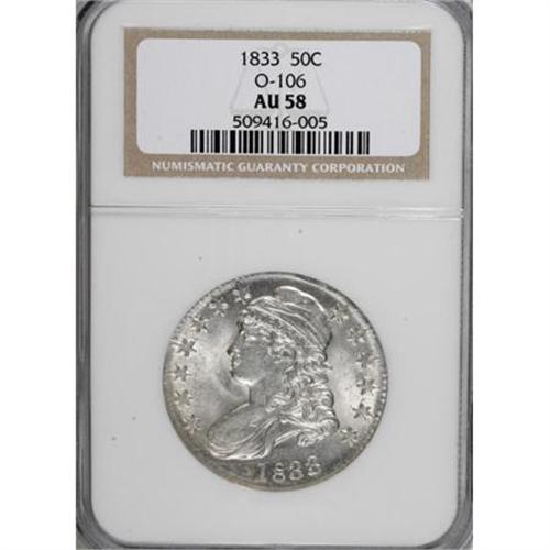 <B>1833 50C AU58 NGC.</B></I> O-106. NGC Census: (252/296). PCGS Population (163/233). Mintage: 5,206,000. Numismedia Wsl. Price for NGC/PCGS coin in AU58: $575. (#6163)<BR><BR><B>Coin Engraver:</B> John Reich<BR><BR><b>Shipping:</b> Coins & Currency (<a target="_blank" href="http://www.heritageauctions.com/common/shipping.php">view shipping information</a>)