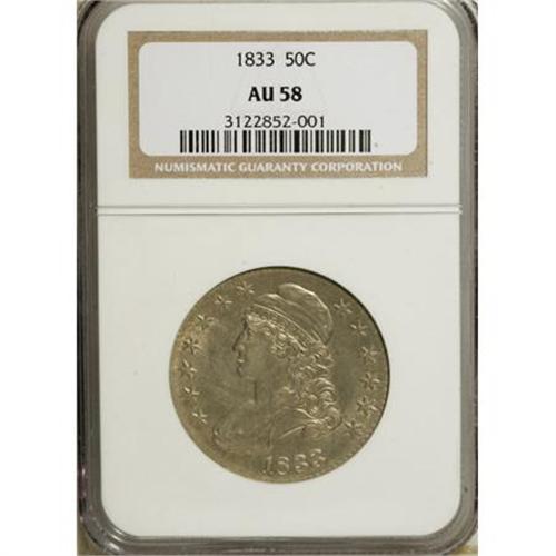 <B>1833 50C AU58 NGC.</B></I> NGC Census: (259/298). PCGS Population (175/250). Mintage: 5,206,000. Numismedia Wsl. Price for NGC/PCGS coin in AU58: $575. (#6163)<BR><BR><B>Coin Engraver:</B> John Reich<BR><BR><b>Shipping:</b> Coins & Currency (<a target="_blank" href="http://www.heritageauctions.com/common/shipping.php">view shipping information</a>)