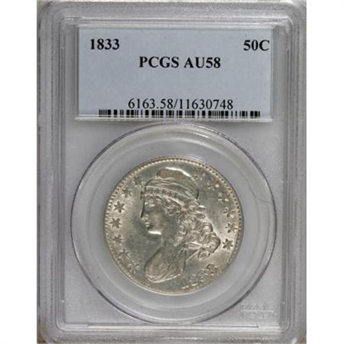 <B>1833 50C AU58 PCGS.</B></I> PCGS Population (158/226). NGC Census: (248/292). Mintage: 5,206,000. Numismedia Wsl. Price for NGC/PCGS coin in AU58: $575. (#6163)<BR><BR><B>Coin Engraver:</B> John Reich<BR><BR><b>Shipping:</b> Coins & Currency (<a target="_blank" href="http://www.heritageauctions.com/common/shipping.php">view shipping information</a>\)