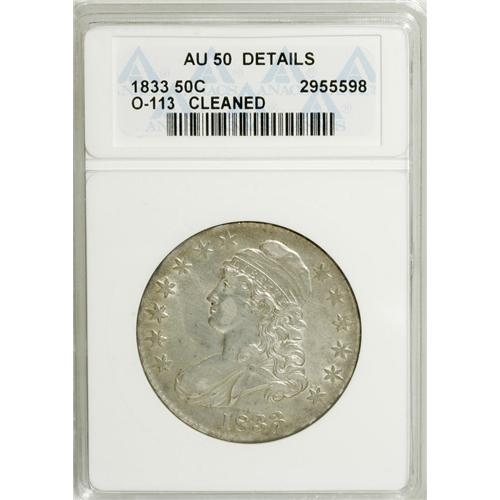 <B>1833 50C --Cleaned--ANACS. AU50 Details.</B></I> O-113. NGC Census: (42/717). PCGS Population (83/559). Mintage: 5,206,000. Numismedia Wsl. Price: $221. (#6163)<BR><BR><b>Shipping:</b> Coins & Currency (<a target="_blank" href="http://www.heritageauctions.com/common/shipping.php">view shipping information</a>)