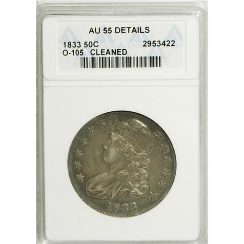 <B>1833 50C --Cleaned--ANACS. AU55 Details.</B></I> O-105. NGC Census: (120/537). PCGS Population (120/385). Mintage: 5,206,000. Numismedia Wsl. Price: $275. (#6163)<BR><BR><b>Shipping:</b> Coins & Currency (<a target="_blank" href="http://www.heritageauctions.com/common/shipping.php">view shipping information</a>)