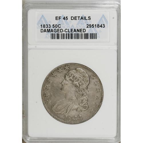<B>1833 50C --Cleaned, Damaged--ANACS. XF45 Details.</B></I> NGC Census: (61/757). PCGS Population (73/642). Mintage: 5,206,000. Numismedia Wsl. Price: $124. (#6163)<BR><BR><b>Shipping:</b> Coins & Currency (<a target="_blank" href="http://www.heritageauctions.com/common/shipping.php">view shipping information</a>)