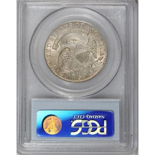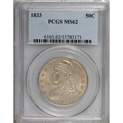 <B>1833 50C MS62 PCGS.</B></I> O-107, R.3. Medium caramel-gold and ivory-gray toning drapes this satiny and unmarked representative. The star centers and the RI in PLURIBUS are typically defined, but the eye appeal is exceptional for the assigned grade.<BR><BR><B>Coin Engraver:</B> John Reich<BR><BR><b>Shipping:</b> Coins & Currency (<a target="_blank" href="http://www.heritageauctions.com/common/shipping.php">view shipping information</a>)